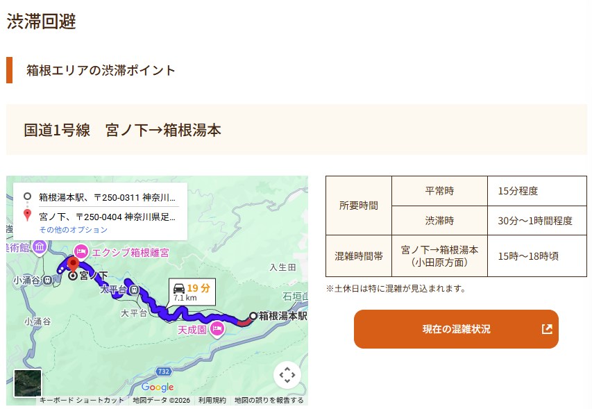 箱根ナビ公式の「お車でお越しの方」では、国道1号線の入生田→箱根湯本、宮ノ下→箱根湯本、大涌谷駐車場入口が渋滞ポイントとして明示されています。