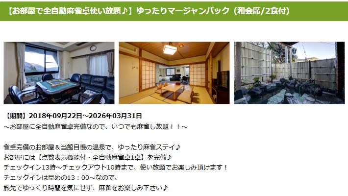 公式の客室ページに「全自動雀卓付き客室」プランが掲載され、“お部屋についた全自動雀卓でいつでも好きなだけ”と書かれているのが強み。