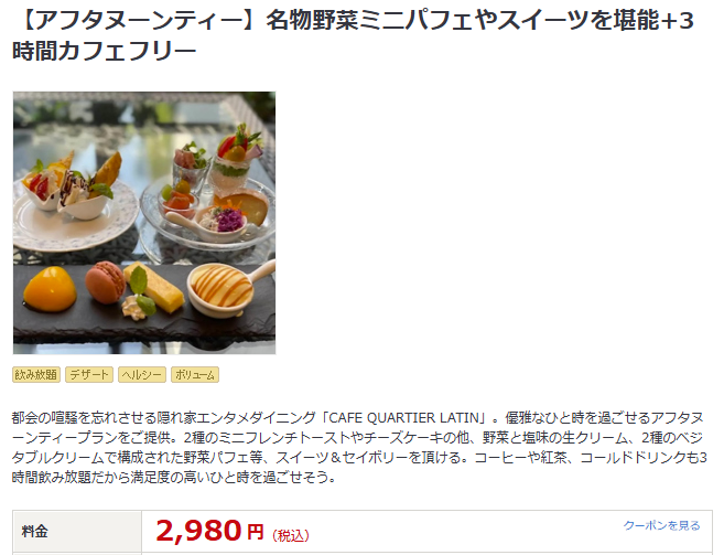 2,980円で3時間カフェフリーを含むアフタヌーンティー系プランが確認できます。