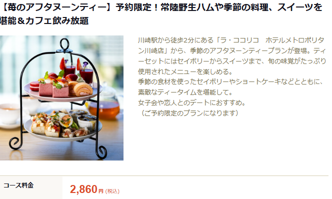 たとえば ラ・ココリコ ホテルメトロポリタン川崎店 は、アフタヌーンティープラン2,860円(税・サ込)の掲載があり、予約サイト側でポイント利用が可能と明記されています。