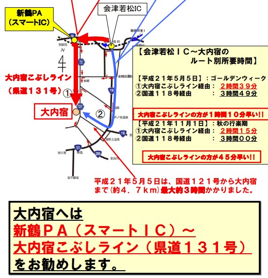下郷町が公開している渋滞調査資料では、会津若松ICから大内宿へ向かう際、GW中日は「大内宿こぶしライン(県道131号)」経由のほうが、国道118号経由より平均的に早かったと示されています。