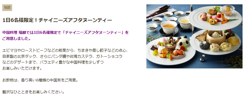 | パレスホテル大宮 中国料理 瑞麟 | 大宮 | 3,850円~ | 中華点心×アフタヌーンティー | 甘いだけが苦手、食事重視派 |