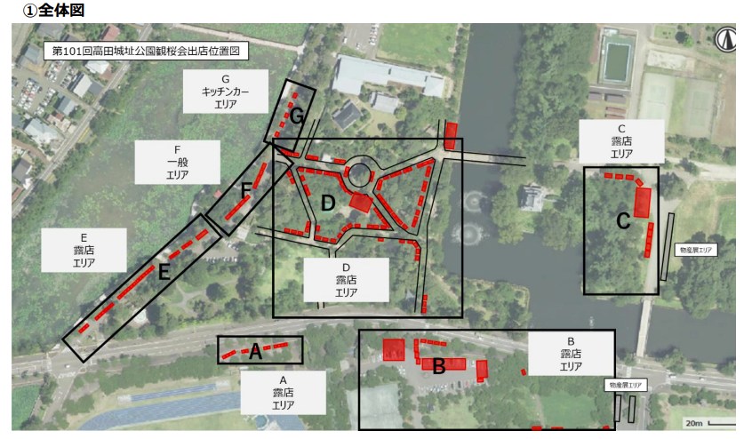 全体図を見ると、公園の主要動線や橋の周辺、園路沿いに複数のブロックが配置されていて、夜桜の見どころと食べ歩きができる設計です。