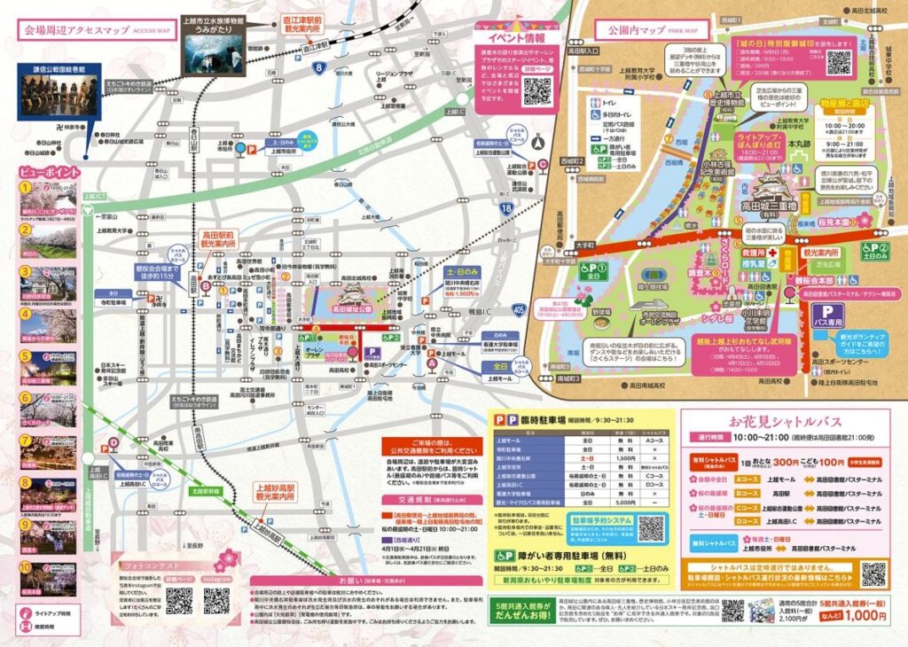 通常の高田城址公園には第1〜8駐車場がありますが、観桜会期間中は公園内の駐車場は利用できません。