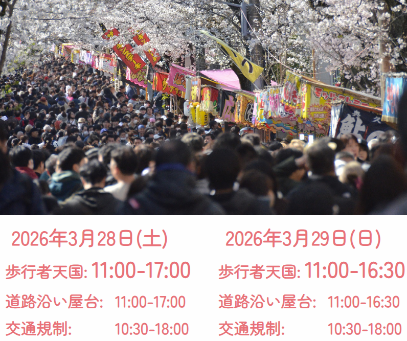 約2kmにわたる桜並木が歩行者天国となり、数多くの屋台が立ち並ぶ春の一大イベントです。